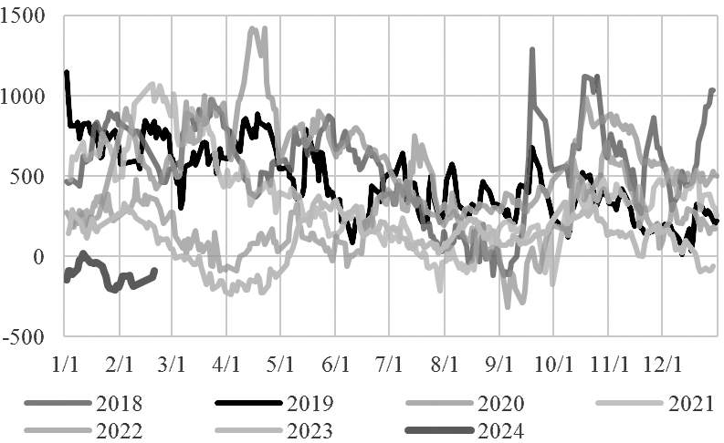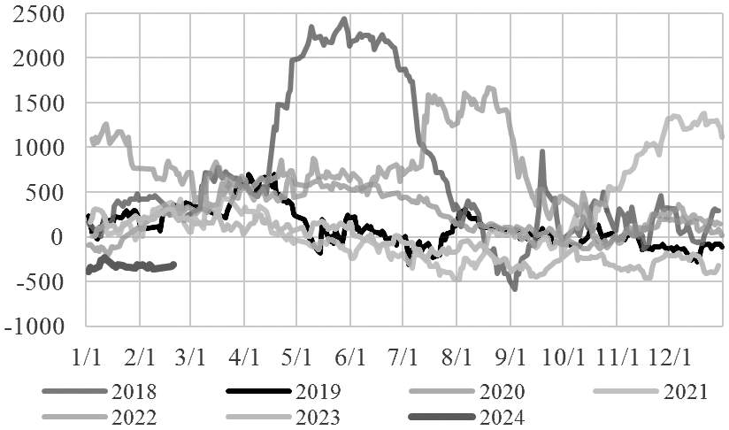 供给端有利好出现,需求端也出现了利空因素。从三大机构最新月报对需求前景的预测来看,虽然EIA和OPEC变动不大,但IEA大幅下调了2024年全球原油需求,仅有120万桶/日,是所有预测中的最低值,较去年同期下滑40%,意味着2024年原油市场需求前景仍不乐观。此外,美国炼厂开工率持续下滑,较春节假期前下跌1.80%;美国商业原油出现累库迹象,库存较春节假期前上涨2.81%,市场对需求前景的预测呈现利空趋势。