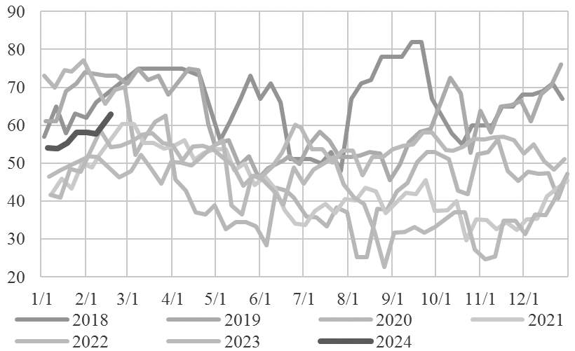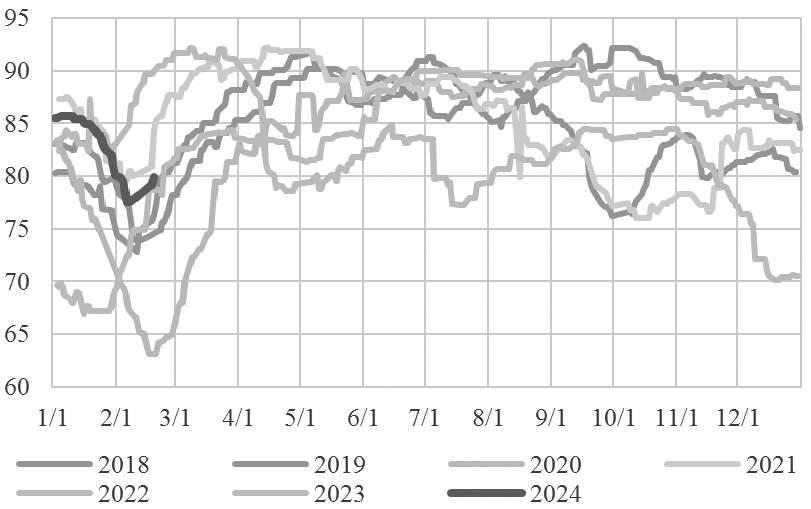 从整个华东地区来看,库存合计在74.79万吨,相较于去年年底下降约30.5万吨。产能方面,截至2月15日,国内乙二醇总产能利用率在65.89%,环比上升2.88%,其中一体化装置产能利用率为68.74%,环比上升2.80%;煤制乙二醇产能利用率为60.79%,环比上升3.03%。