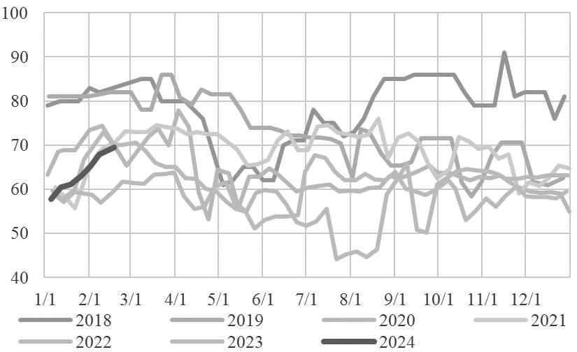开工方面,聚酯产业在扩能高峰期下竞争压力较大,行业常处于亏损境地,节后聚酯产业链开工率偏低于预期。从涤纶短纤自身供需来看,由于加工费持续低位,春节假期期间短纤工厂检修力度较大,产能利用率最低达到61.51%,远低于聚酯综合产能利用率。并且部分短纤工厂检修时间较长,后续工厂累库的压力将有所减轻。