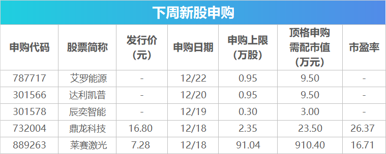 下周,将有5只新股网上发行。其中,12月18日发行的是莱赛激光、鼎龙科技;12月19日发行的是辰奕智能;12月20日发行的是达利凯普;12月22日发行的是艾罗能源。